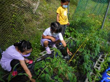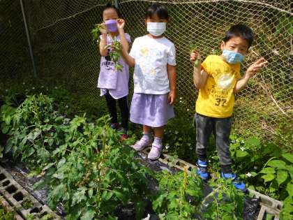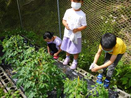 カゴメトマト苗「凛々子」の育てやすさの秘密は,芽かきを1回しかしなくていいことです。普通のトマトはぐんぐん伸びるかわりにどんどんわき芽が出て,わき芽かきをしないとジャングルのように茂ってしまい,日が当たらなくなって生育が悪くなります。そのため,こまめなわき芽かきと支柱立てが必須です。けれど,凛々子は第3〜第4花房で生長点が止まる芯止まり品種のため,支柱も立てなくてもいいし,芽かきも花が咲いたときに1度だけでいいのです。6月23日に,その1度だけの芽かきを行い,ついでに花を揺らせて着果促進したり,追肥したりしました。1年生は,間違って茎まで取ってしまわないように確かめながら慎重にわき芽をつんでいました。