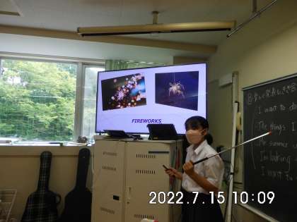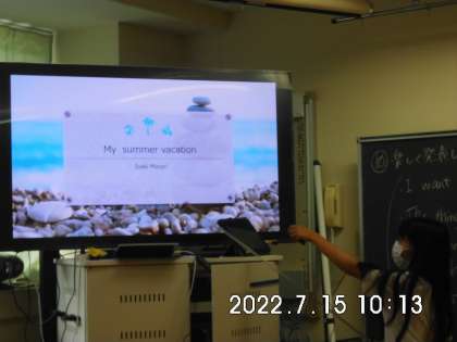 7年生英語の授業では定期的にプレゼンテーションを行っています。今回は「夏休みにしたいこと」について発表しました。生徒たちは一生懸命わかりやすいスライドを作り、伝えたいことを英語で表現していました。最後のふりかえりでは「クラスメートのプレゼンテーションの良さを次のプレゼンテーションに活かしたいです。」「次のプレゼンテーションも楽しみです。」などと前向きな声が上がりました。