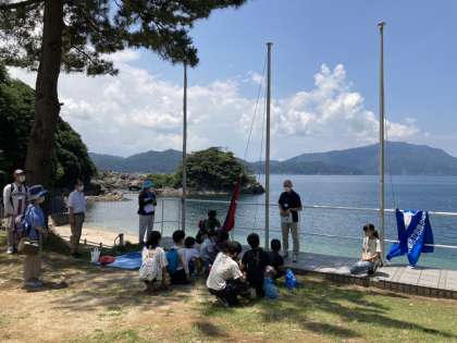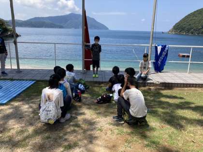 到着後、すぐにはじまりの集いを行いました。誓いの言葉、板垣校長先生の話、自然の家の方のお話に引き続いて、両校の旗をあげました。