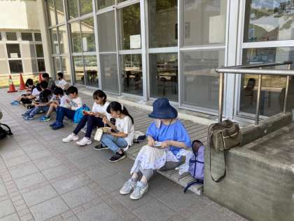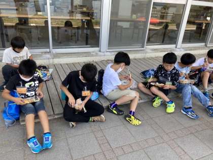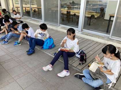 はじまりの集いの後、待ちに待ったお弁当タイムです。つどいの広場前で、いただきました。お腹が減っていたのか、みんなおいしそうに食べました。