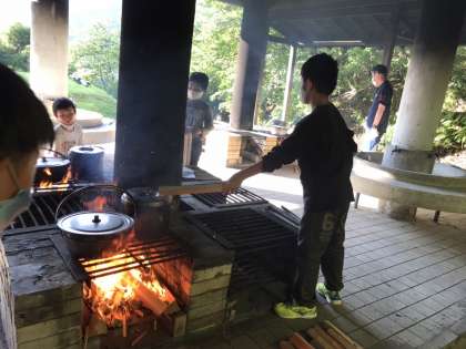 野外炊事、かまど係、ご飯係、野菜係に分かれてそれぞれ責任を持って取り組み、協力して美味しいカレーが出来上がりました。つい先ほど食べ終えたとこれです。これから片付けていきます。