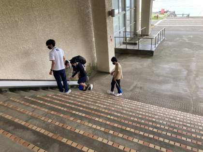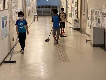朝のつどいの後は、清掃活動です。大階段やおくつろぎホールなどを掃除しました。みんな一生懸命頑張っていました。