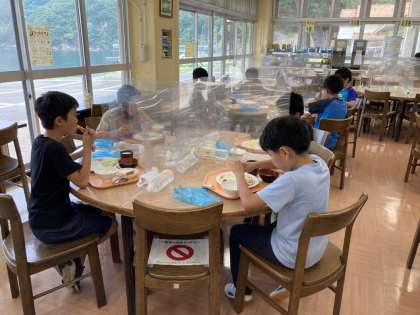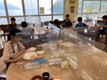 お掃除の後は、朝食です。自然の家に来てはじめての食堂利用です。バイキング形式で、トングを使うときには手袋をはめてとっていきました。マスクを外して、黙食。でも、みんな美味しそうにいただきました。