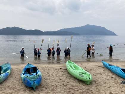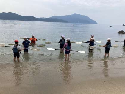 午前の部のアクティビティーシーカヤックに向けて、海に漕ぎ出す前に練習をしました。パドルの使い方について色々と説明を受け練習をしました。