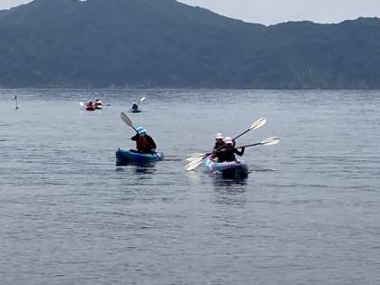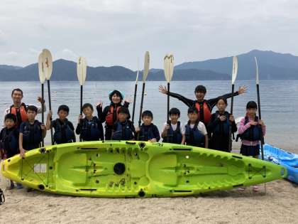 若狭湾の探検を終えて自然の家前の浜に戻ってきました。パドルを漕いで長い距離を探検したので、腕が疲れたと言っていました。でも、みんなとても清々しい顔をしていました。最後に記念写真も撮りました。素晴らしい思い出になりました。