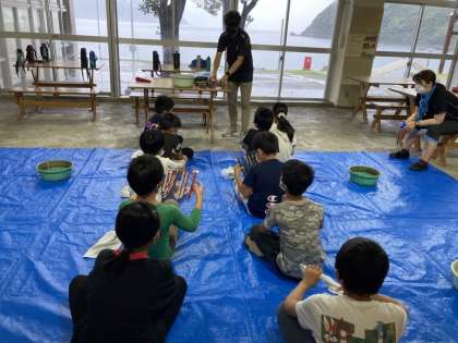 午前の活動は、磯観察を予定していましたが、外は大雨なので、荒天プログラムに変更です。お土産として持ち帰るように、若狭塗り箸作りに挑戦します。