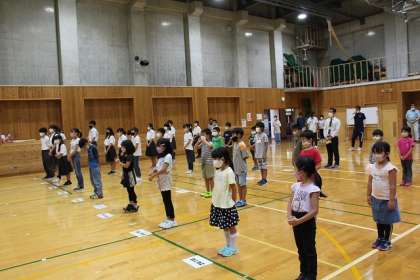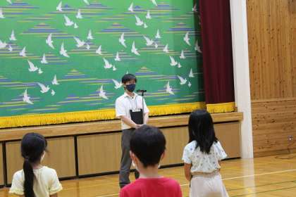 校歌静聴に引き続いて、教頭先生からお話がありました。明日(7月23日)から夏休みです。次の3つのような夏休みにしてほしいというお話がありました。「1学期を振り返る夏休み」「熱中する夏休み」「元気な夏休み」特に、「元気な夏休み」には、必ずしてほしい。コロナや熱中症にならないように。事故(交通事故・水の事故)にあわないように。安全で楽しく元気な夏休みに。8月25日の始業式にみんなニコニコして集まってほしい。