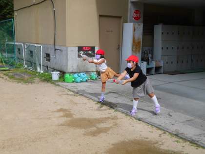 8月29日に生活科で、夏休みの間に集めたマヨネーズの容器を使って水遊びをしました。水で絵をかいたり、棒倒しをしたり、どこまで水をとばせるか競ったりと、夏の遊びを楽しみました。少しぐらい水がかかっても平気で遊べるのはやっぱり季節が夏だからですね。