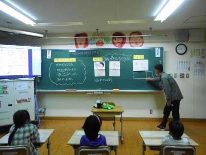 17日に、栄養教諭の先生から、なぜ牛乳は給食に毎日出てくるのか、そのひみつを教えていただきました。カルシウムは骨を作る大事な栄養素であること、牛乳にはそカルシウムが他の飲み物にくらべてとても多いことなどが1年生にもよくわかりました。カルシウムの量を表した巻物を使って、牛乳とお茶やオレンジジュース、豆乳などを比べた1年生は「牛乳すごい!」と驚きの声を上げていました。