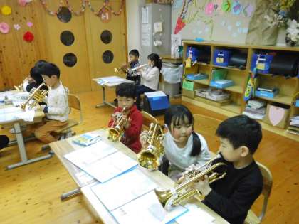 1年生は、ぐんぐんタイムに、2年生からコルネットについて学びました。ケースからの出し方、構え方、ふき方、指使いなど、2年生が1年間かけて身に付けたことを、ていねいに教えてくれて、2年生の真似をして、1年生もがんばって音を出してみました。吹けるようになるのが楽しみです。