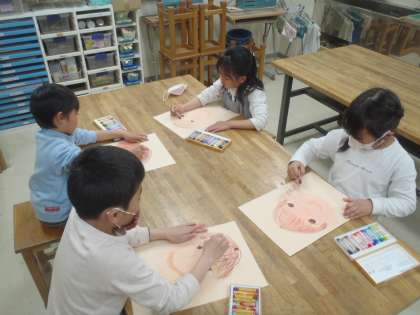 図画工作科の時間にパスを使って「自分の顔」をかきました。パスで色を塗り重ねる楽しさを味わいました。