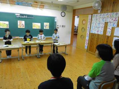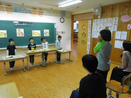 学習のまとめとして、お客さんにきてもらって、音読発表会を行いました。教科書の文章を読むだけでなく、学習したときに考えたセリフも入れながら、上手に読むことができました。聞いていただいた先生から「大きな声でしっかり読めました。」「考えたセリフも入っていてよかったです。」「みんなの音読を聞いて、楽しくてにこにこ笑ってしまいました。」など、たくさんほめてもらって、1年生もにこにこ笑顔になりました。