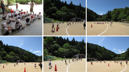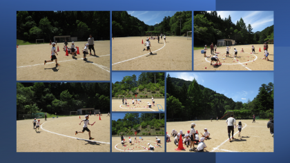 体育の時間に1期合同の体育を行い、運動会の練習に取り組んでいます。リレーや玉入れなどチームで協力して自分達の力を高めていっています。