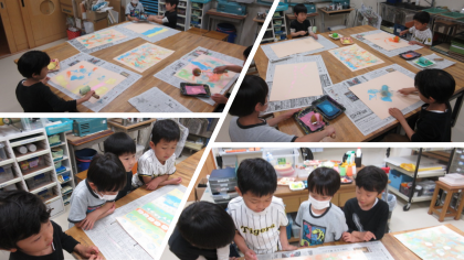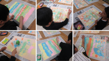 1年生は、図画工作科の時間に「ころころぺったん」という題材に取り組みました。ローラやスタンプを使った表現を楽しみました。