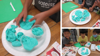 1年生は図工の時間に「ごちそうパーティー」という題材に取り組みました。油粘土や、紙粘土を伸ばしたり、切ったり、丸めたりして「自分の食べたいもの」を工夫して作りました。