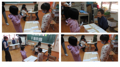 3校時は、1年生教室で国語科の学習を参観してもらいました。漢字とカタカナの学習をしているところを見てもらったり、買い物「ものの名まえ」の学習を生かした「買いもの遊び」に一緒に参加してもらったりしました。新しい1年生に勉強が楽しいことを伝えようと、いつもよりさらに張り切っている様子の1年生たちでした。