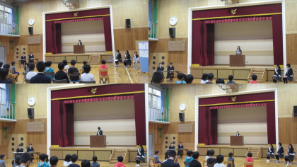 11月10日に児生会選挙を行いました。本部役員に4人の児童生徒が立候補し、演説を行いました。演説では「立候補した理由」「スローガン」「自分たちがどのように学校をよりよくしていくのか」について全校児童生徒に向けて伝えました。