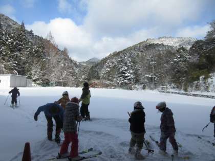 体育科の時間に冬の体験学習として「スキー体験」を行いました。スキー靴のはき方から、安全な倒れ方や置き方など基本をしっかり学んで、校庭をスキーで歩いたり、滑ったりしました。
