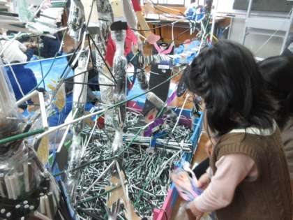 左京北支部の育成学級の友だちと一緒にストローを使った造形遊びや作品作りに取り組みました。ストローやペットボトルでできた素敵なジャングルジムに「小さくなった自分」も飾り付けて楽しい作品が完成しました。
