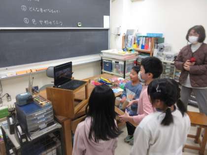 図画工作科の時間に「身辺材を使ってどんな音を出したいか工夫しながら楽器を作りました。作った作品の鑑賞会をzoomを使って、宕陰小中学校の2年生と行いました。