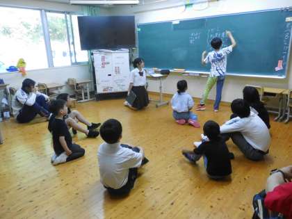 文化祭に向けて1回目の縦割り活動がありました。最初に、文化委員会から今年のスローガンの発表がありました。今年のスローガンは「32人全員でつくりあげる最高の文化祭」です。このスローガンのもと、それぞれのチームに分かれて、文化祭でどんな発表をするのか話し合いました。どのチームも、よりよい発表を保護者や地域のみなさんに見ていただこうと真剣に話し合っていました。