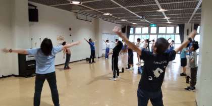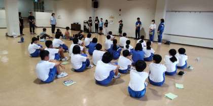 ラジオ体操の後、学校紹介をしました。