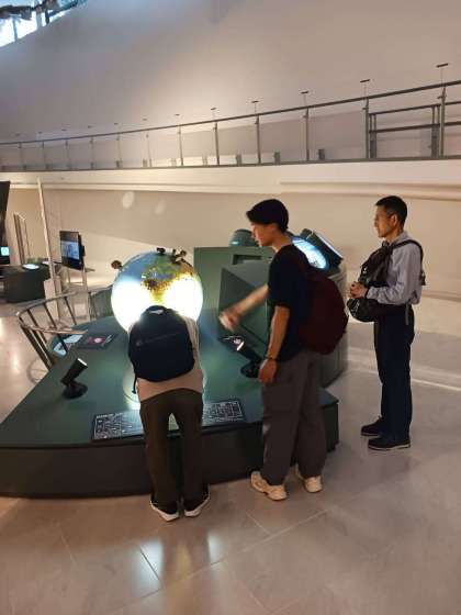 興味をもった展示物を見ながら、社会科の先生に質問して学びを深めています。