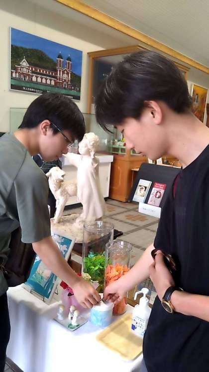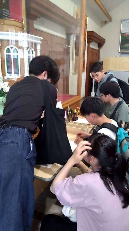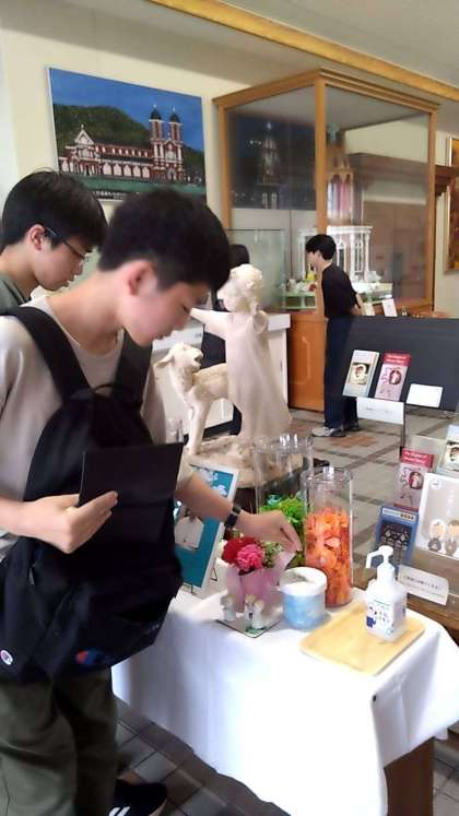 浦上天主堂 原爆遺物展示室で鶴を折っています。