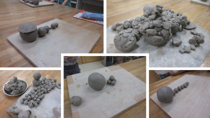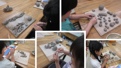 図画工作科の時間に土粘土をを使った造形遊びに取り組みました。粘土できれいな玉をたくさん作って並べたりつなげたりして遊びました。まん丸の玉を作るためには、どうすればいいのか手の感覚を確かめながら活動を楽しむ様子がみられました。