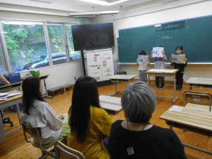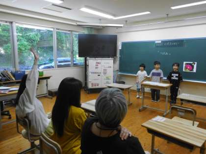 学習のまとめとして、お客さんに来ていただいて音読クイズ大会をしました。「これはなんでしょう。」の問いかけにお客さんも「難しいなあ、何だろう。」と頭をひねって考えていました。音読だけでなく図鑑で調べて作った自分の問題も解いてもらいました。正解すると歓声が聞こえ、楽しんでもらった1年生もにこにこ笑顔でした。