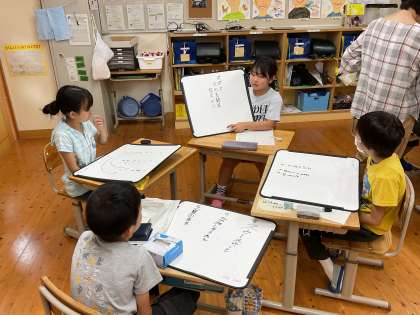 夏ならではの言葉「季語」をたくさん出しあった後、その言葉からイメージできることをふくらませ、俳句にしました。