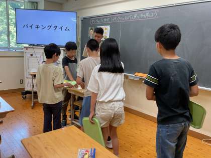今日は、5・6年生合同の食の学習がありました。サマーキャンプに向けて、バイキングでのおかずの選び方を考えました。「黄」「赤」「緑」の食品のバランスが「3:1:2」になるように取ると、栄養バランスが良くなるということがわかりました。また、食事のマナーや、自分の体と相談しながら、自分が食べ切れる量を取るといったことに気をつけていくことの大切さも学びました。