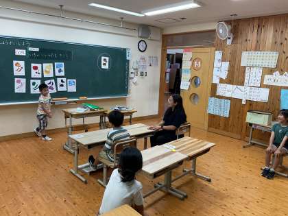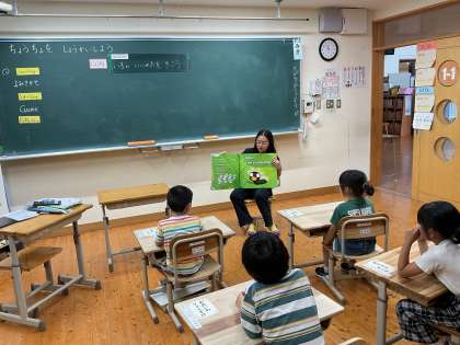 1・2年生では「ちょうちょを しょうかいしよう」という学習をしています。ALTの先生に"A Beautiful Butterfly"という絵本を読み聞かせしてもらいました。絵やジェスチャーをよく見たり、先生の英語をよく聞いたりして、興味をもって学習している様子でした。