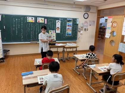 1・2年生では道徳で「せかいのひとと なかよくなるには どうすればいいのだろうか。」というめあてに向かって学習しました。日本人と外国人の役割になってあいさつをして、そのときの気持ちを考えました。すると「あいさつをすると、きもちがよくなった。」「うれしいきもちになった。」とたくさんの気づきが出てきました。授業の最後に、せかいのひとと なかよくなるには「やさしくする。」「あいさつをする。」「たのしくすごす。」という考えが出てきました。めあてに対する自分の考えをもつことができたことがすてきです。
