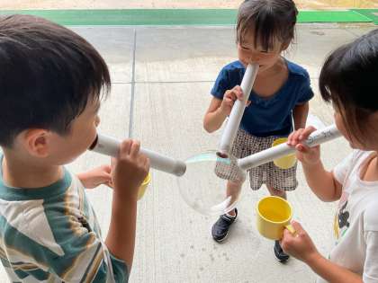 1・2年生では、生活科で「シャボン玉遊び」をしました。固形の石鹸を削ってお湯に溶かして、自分だけのシャボン玉液を作りました。「みんなで繋げ合わせて、大きなシャボン玉を作ろう!」「誰が一番遠くまで飛ばすことができるかな?」と遊びが広がっていく様子が見られました。