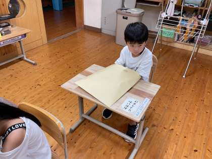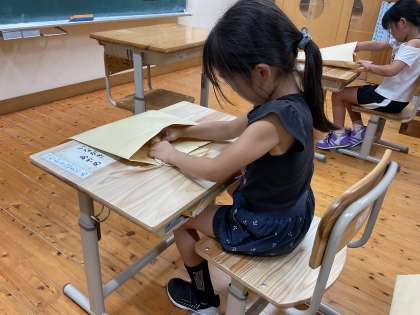 1・2年生では収穫して乾燥させたイエローポップの実をとりました。封筒の中でガサゴソ。実が飛び散らないコツを先生に教えてもらいました。