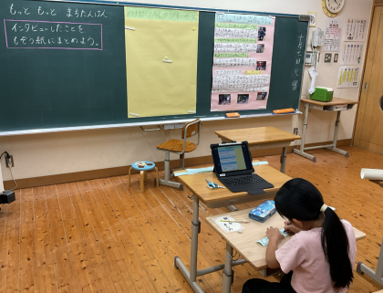 2年生では生活科の「もっともっと まちたんけん」の学習をしています。校外学習で地域の人にインタビューしたことをロイロノートを使って整理して、まとめています。花背学習報告会の準備が進んでいます。