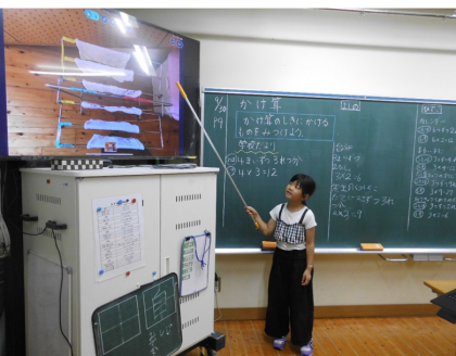 今回はその一場面。校内のかけ算探しです。学校には、かけ算の式に書けるものがいっぱいです。教室で学んだ算数が生活場面につながっていきます。