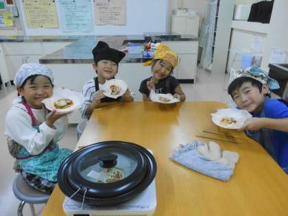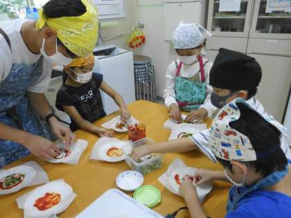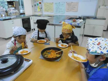 凛々子で作ったケチャップを餃子の皮に塗って野菜をトッピング。チーズをかけて焼いたら、簡単餃子ピザが出来上がり。焼き上がりを待っている間に残った野菜とケチャップを炒めて茹でたパスタを入れたら、簡単パスタの出来上がり。みんなにこにこ笑顔で「おいしい〜」と大喜び。どちらもすぐにできるので、おうちでもぜひやってみてください。