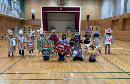 ハロウィンパーティーでは、図画工作科の時間でつくった仮装を披露しました。一人一人の個性があふれていて、とても盛り上がりました。