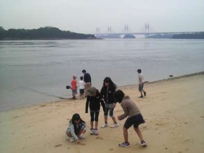 一夜明け,ホテル前に広がる砂浜を散歩。波と遊んだり珍しい生き物を見つけたりと今日も元気な子どもたちです。(写真上)散歩で体を動かしたのでおなかもすいたみたいです。朝からもりもり食べる子どもたちです。(写真下)