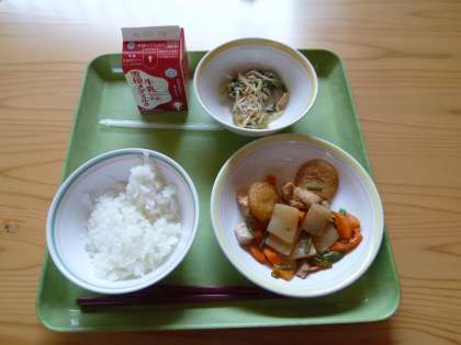 4月15日(火)今日の給食は,ごはん・牛乳・平天とこんにゃくの煮つけ・もやしの煮びたしです。7〜9年の給食には,オレンジゼリーもつきました。