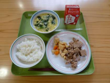 4月18日(金)今日の給食は,ごはん・牛乳・なま節とたけのこの煮つけ・かきたま汁です。
