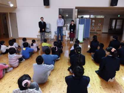 4月30日(水)中間休みに,校長先生より新しい音楽の先生とALTの先生の紹介がありました。