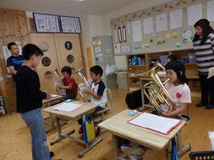 5月31日(土)の運動会で,『ミッキーマウスマーチ』を演奏します。,『ミッキーマウスマーチ』の練習をしています。今日は,1〜6ねんせいの練習でパート毎に分かれて練習しました。次回は,1〜9年生合同で,みんなで合わせた練習をします。