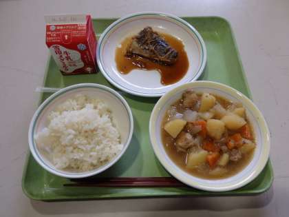 5月15日(木)今日の給食は,麦ごはん・牛乳・さばのしょうが煮・鶏肉とヤシの煮つけです。7〜9年生には,ヨーグルトもつきました。