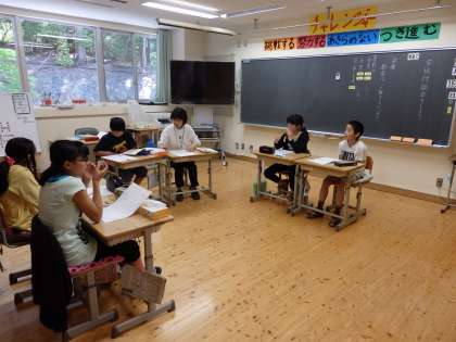 司会・肯定派と否定派・司会に分かれてお互いの立場や意図をはっきりさせて討論をしました。相手の意図をとらえながら聞き,自分の意見と比べながら考えをまとめて発表し合いました。
