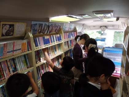 5月19日(月)花背小中学校に移動図書館『こじか号』がやってきました。給食後,12時50分頃より開館しました。たくさんの子どもたちが,移動図書館『こじか号』で本を借りていました。教職員も,本を借りました。月1回『こじか号』がやってくるのをみんながとても楽しみにしています。