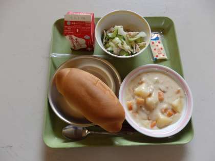 5月21日(水)今日の給食は,コッペパン・牛乳・ハムサンド(具)・クリームシチューでした。