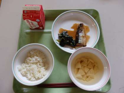 5月22日(木)今日の給食は,麦ごはん・牛乳・さんまのかわり煮・ほうれん草のおかか煮・若竹汁です。